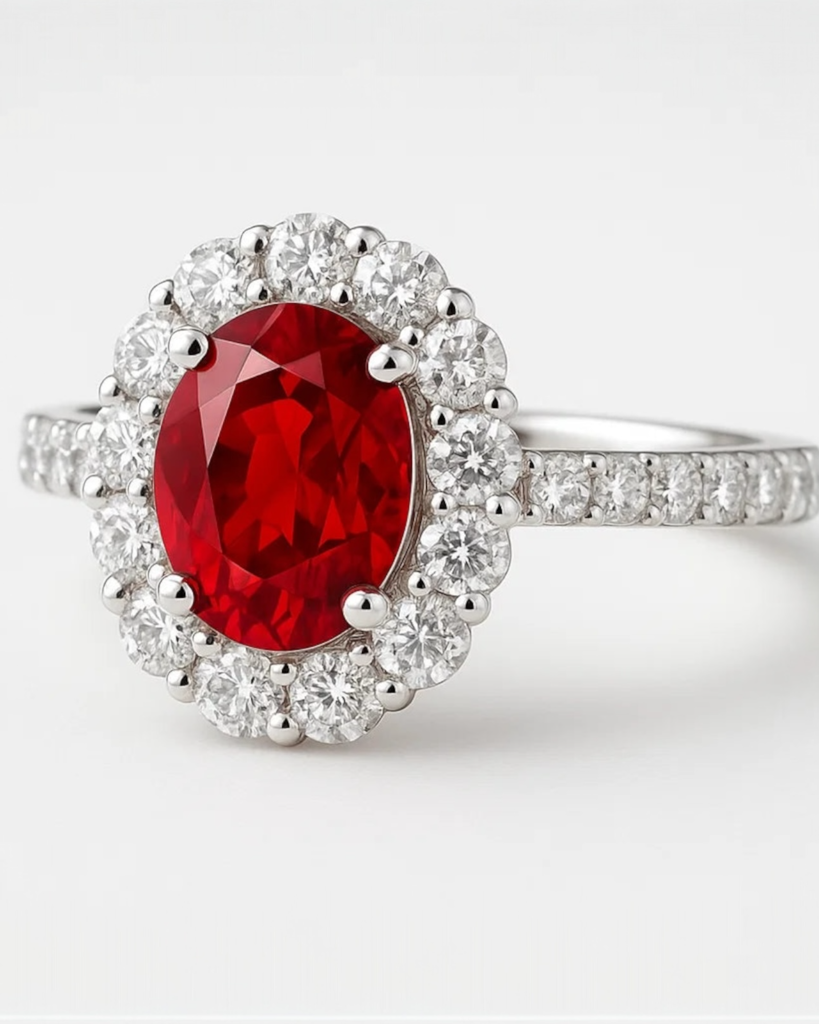 A jewel that burns with regal fire—this ruby-toned solitaire, encircled by a halo of radiant brilliance, channels the timeless elegance of royalty and the fierce passion of a queen.