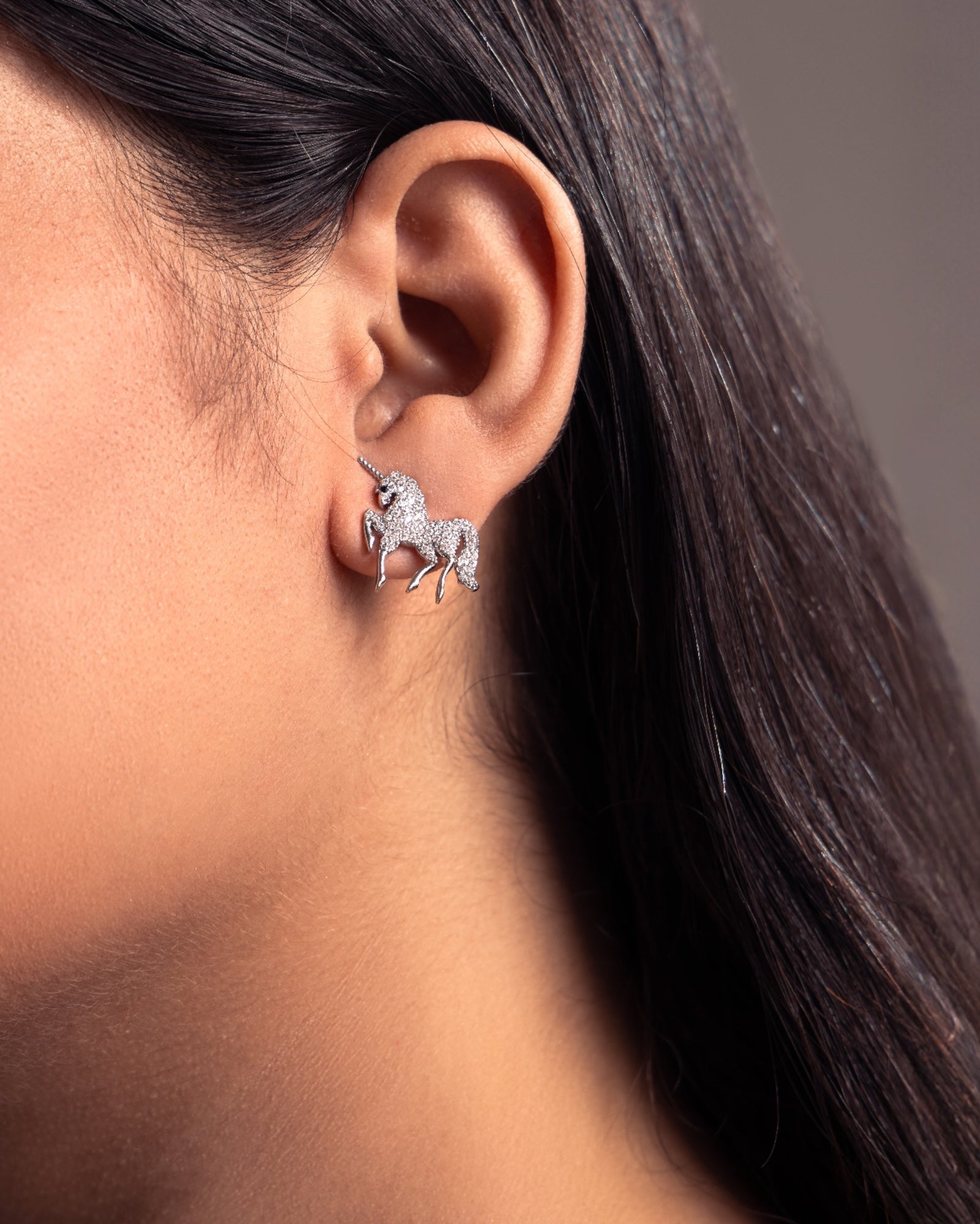 Crafted in glistening silver, each earring captures the poise and rarity of the unicorn itself — once believed to appear only to the pure of heart, now made wearable for those who still believe in wonder.