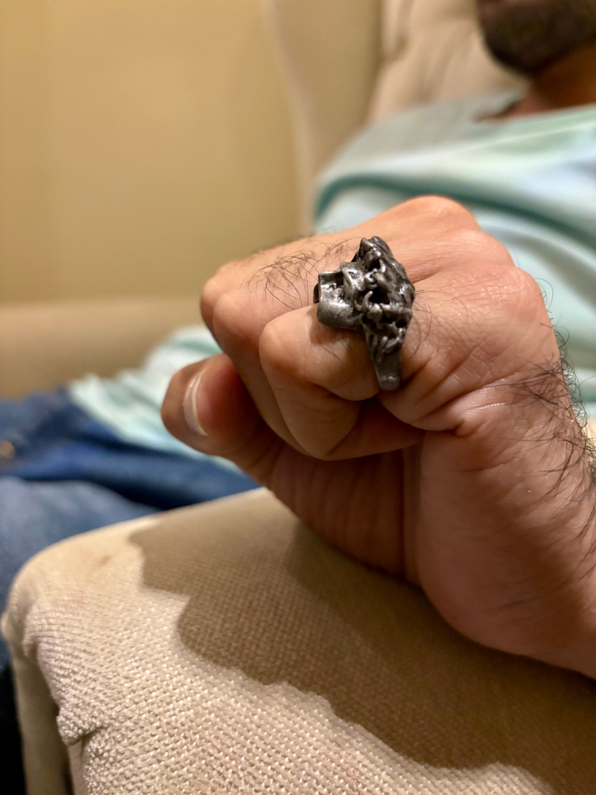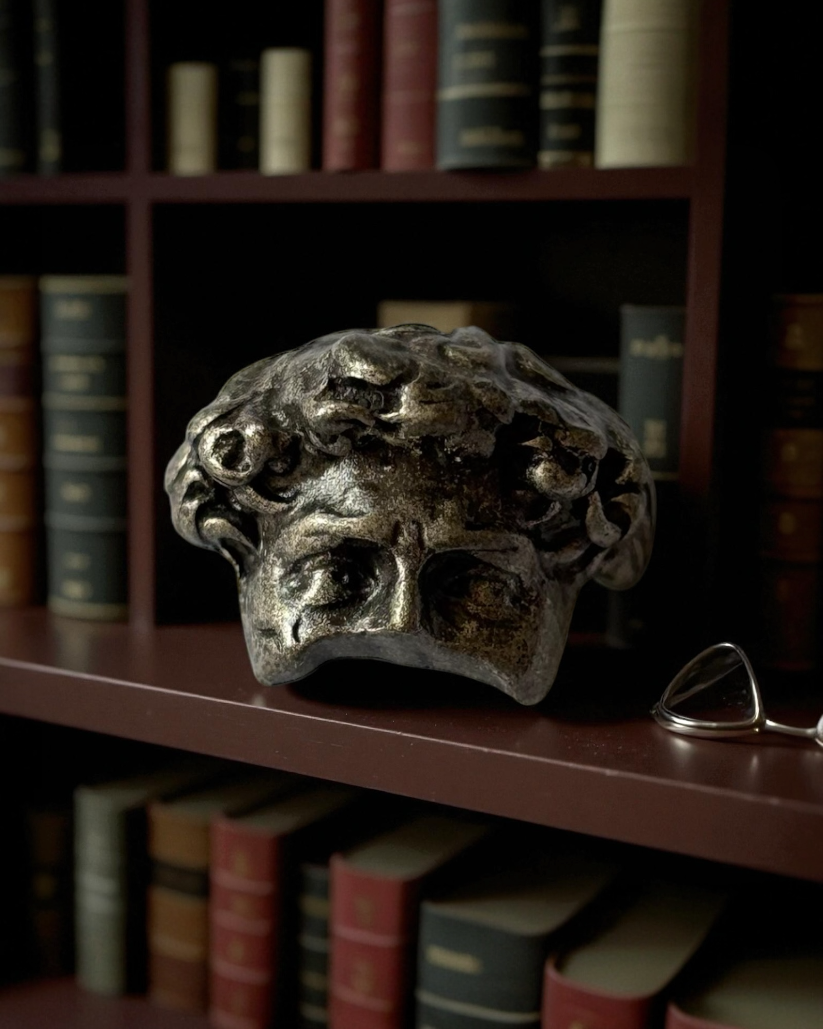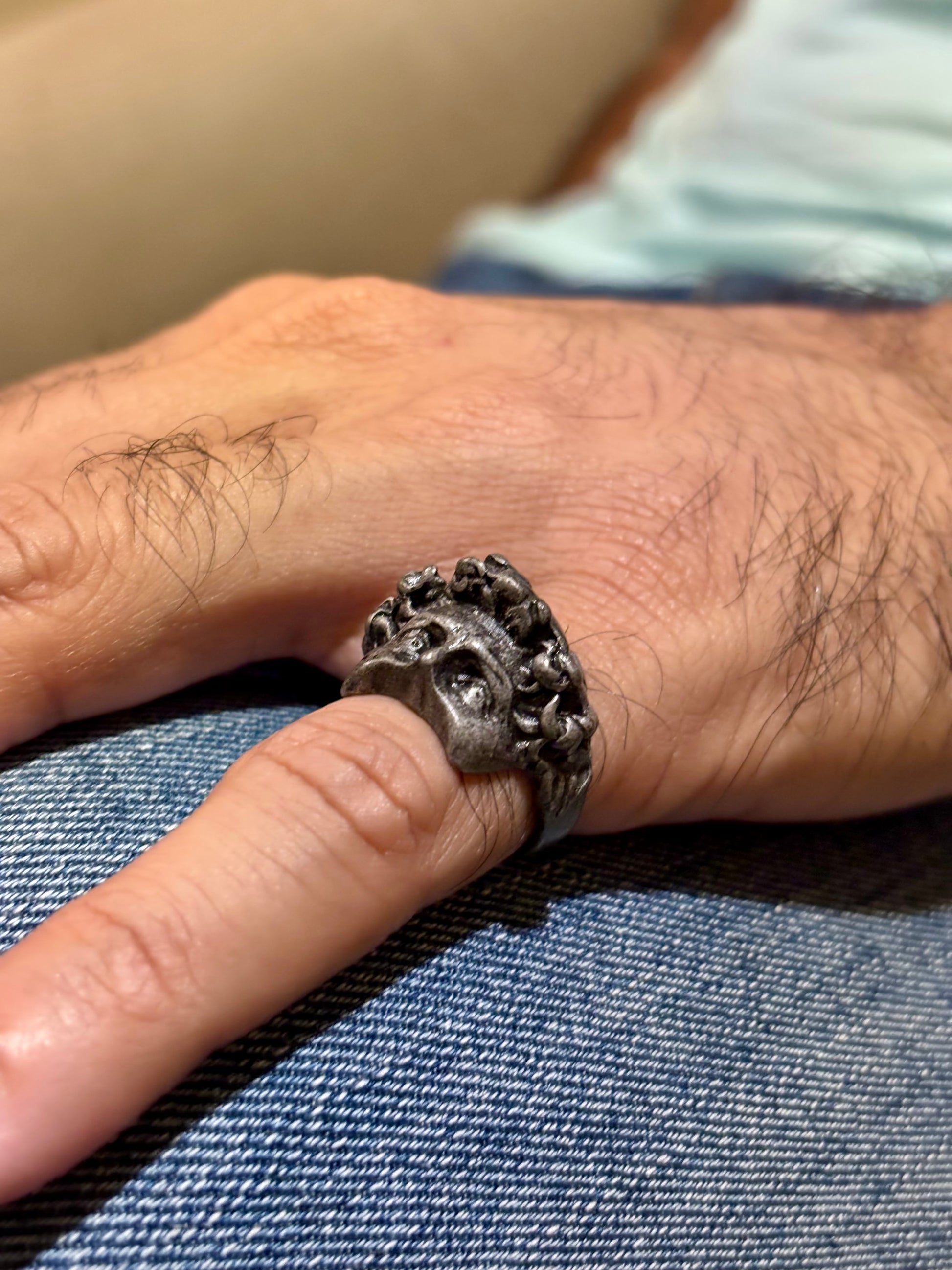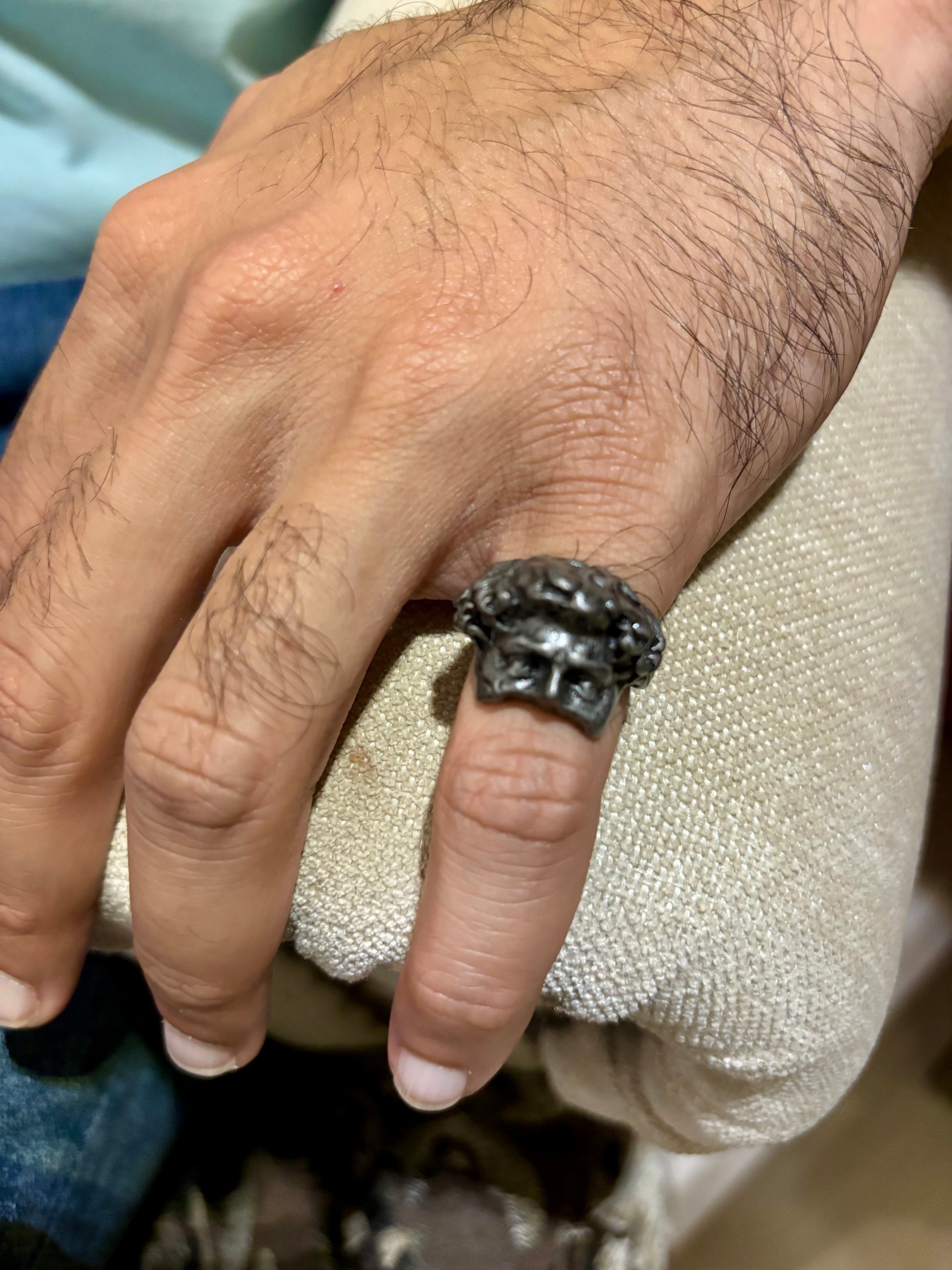 A tribute to timeless intellect and strength, Athenian Relic captures the essence of ancient mastery. Hand-forged in aged silver tones, its sculpted form embodies wisdom, rebellion, and quiet power — a piece that feels excavated from history, yet made for the modern thinker.