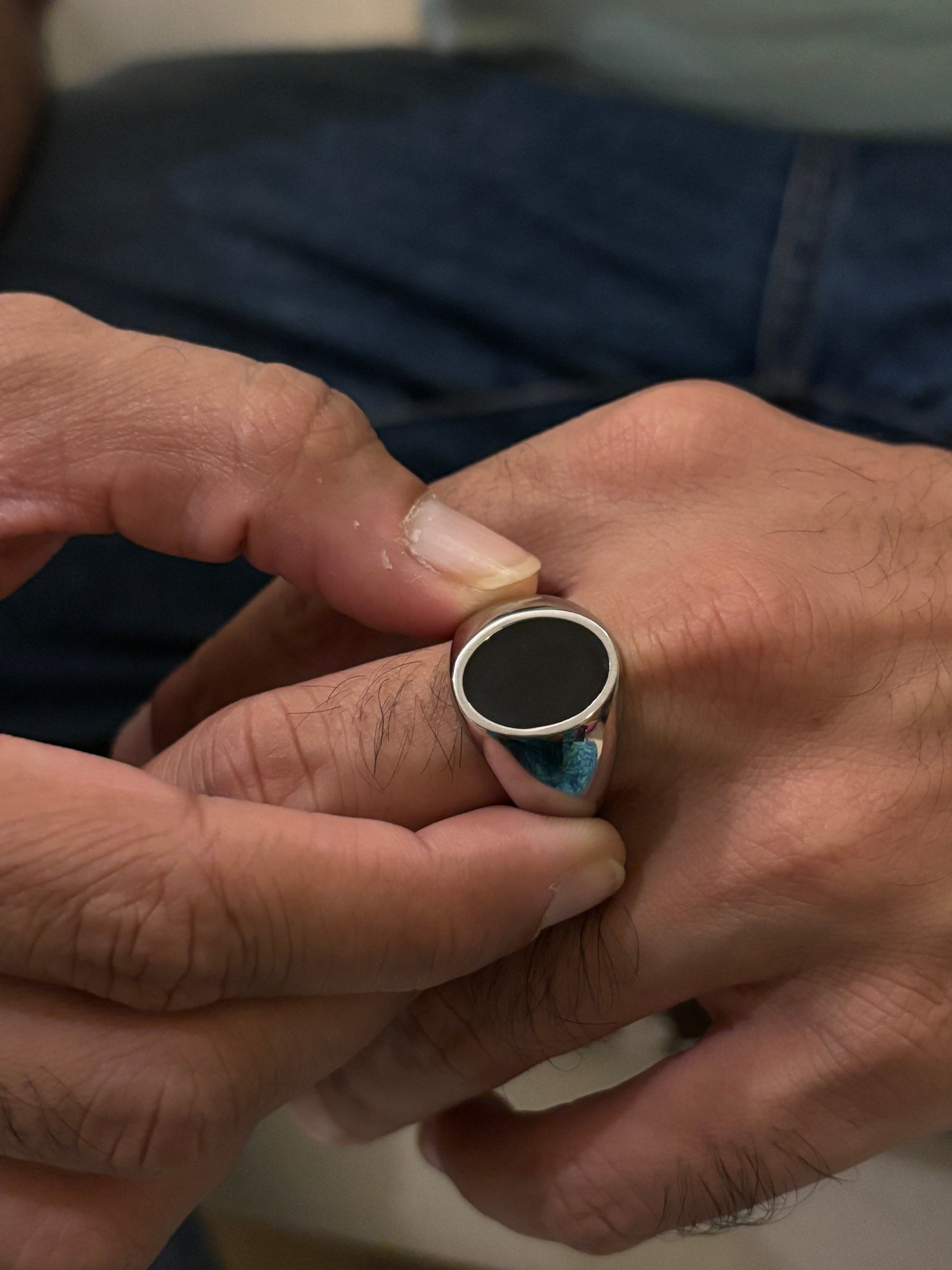 Bold and elemental, this ring speaks of strength veiled in elegance — an untold story wrapped in shadow. With its deep black core and smooth metallic frame, Onyx Veil is for those who lead with quiet command.
