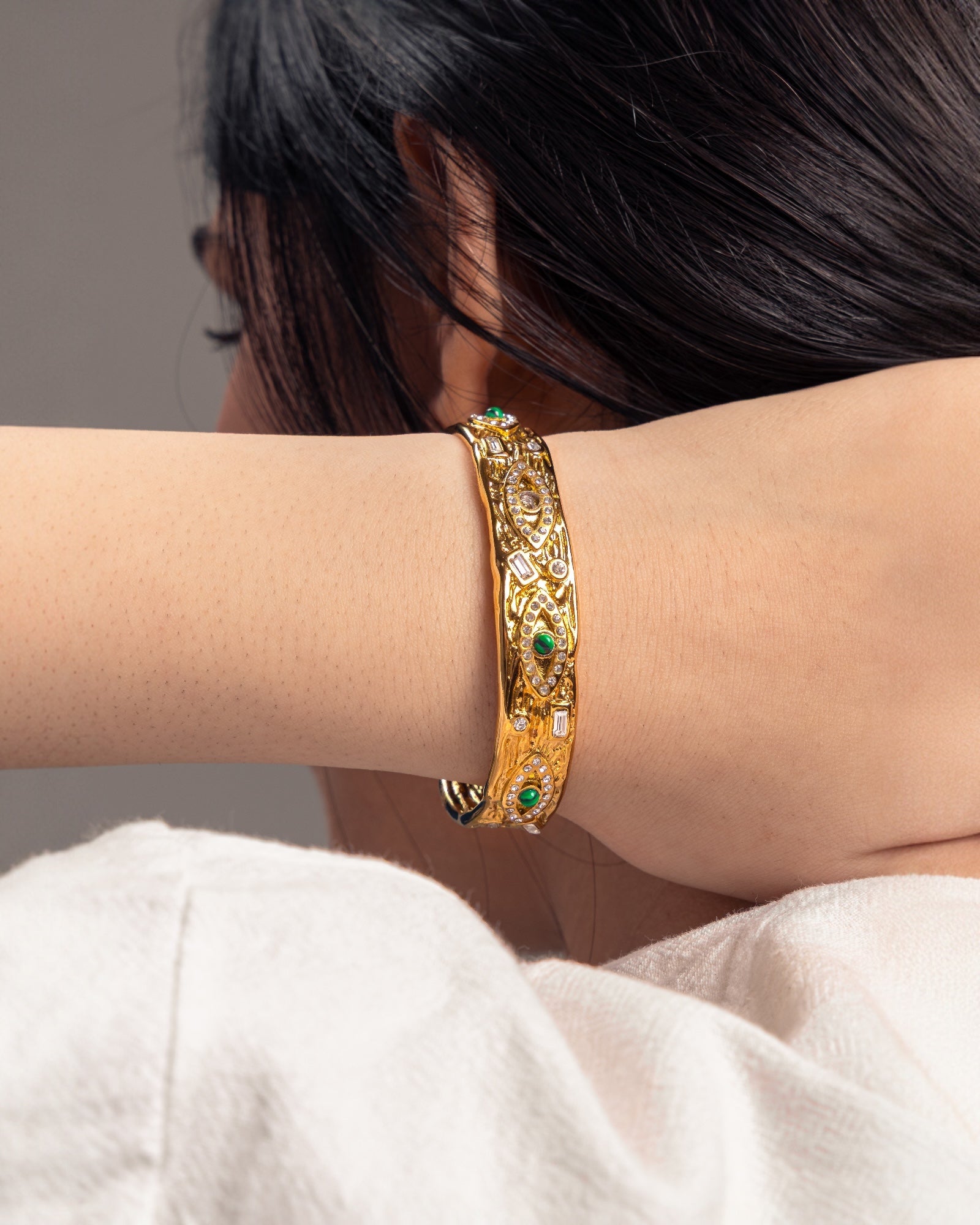 For the girl who trusts her intuition more than opinions. A symbol of protection, power, and poise—etched in hammered gold with emerald detail that speaks to the soul.