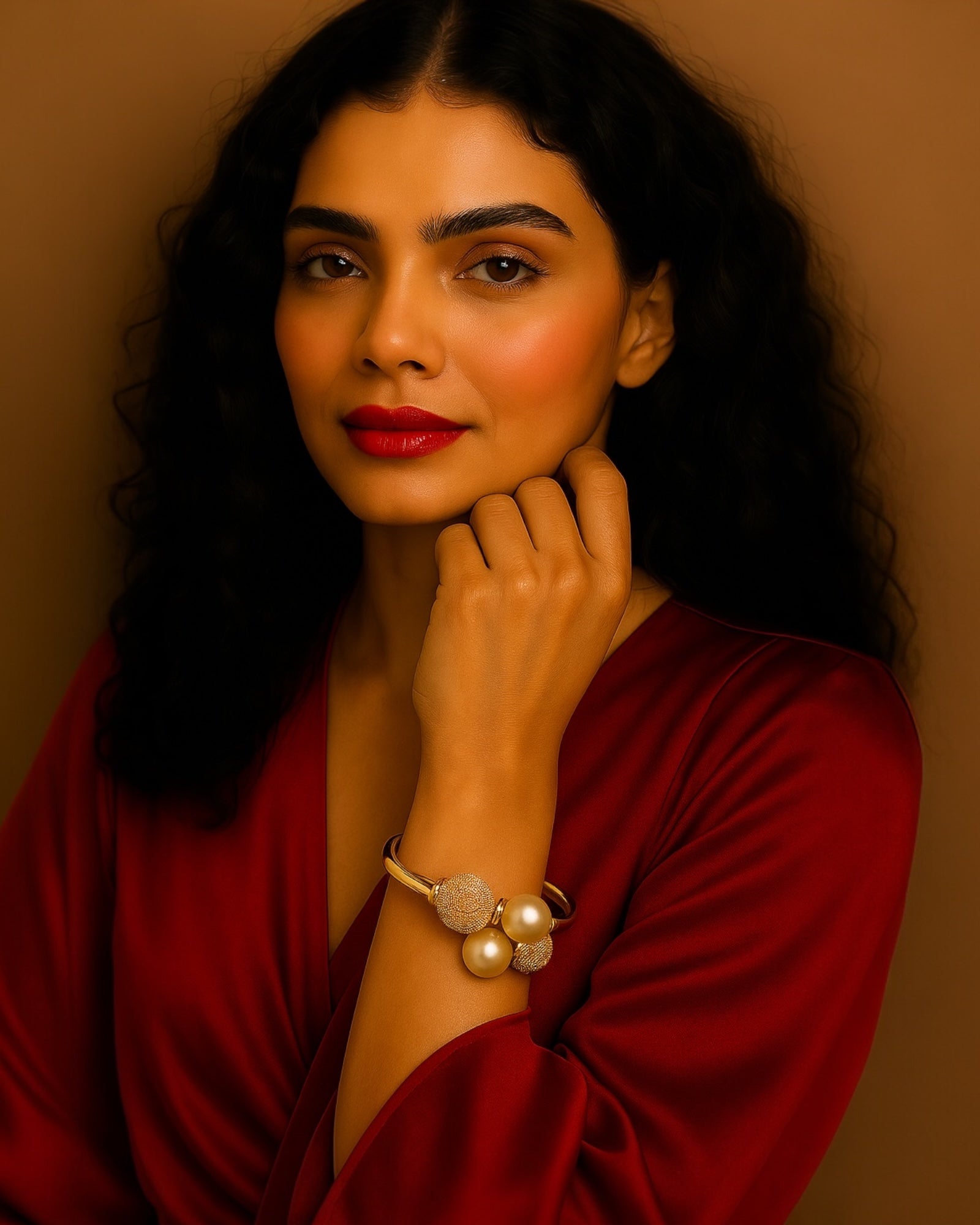 Gracefully bold, endlessly refined—the Golden Dew Cuff is for the woman who speaks volumes in whispers. With luminous pearls and textured gold orbs, it’s a quiet power statement wrapped around your wrist.