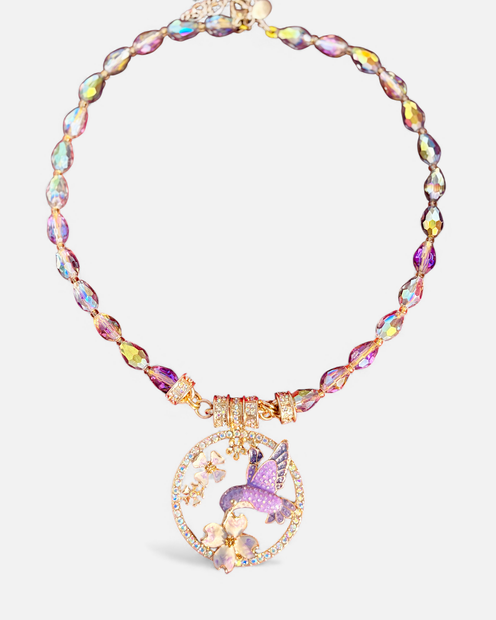 Dance with nature’s most delicate muse — the Hummingbird Reverie Pendant captures a violet-winged wonder mid-flight, sipping from jeweled blossoms. Set in a golden, gem-studded ring and strung with iridescent crystals, this piece is a celebration of movement, light, and enchantment.