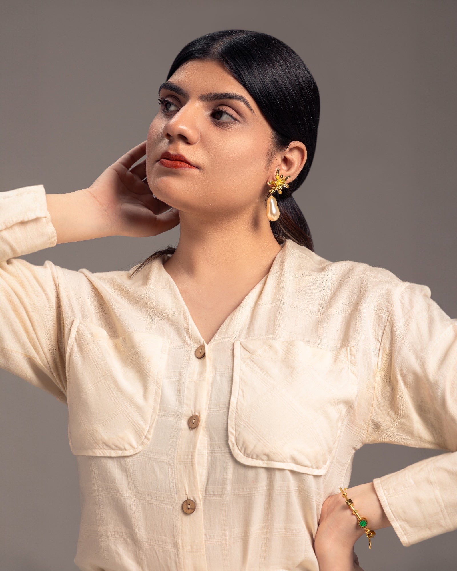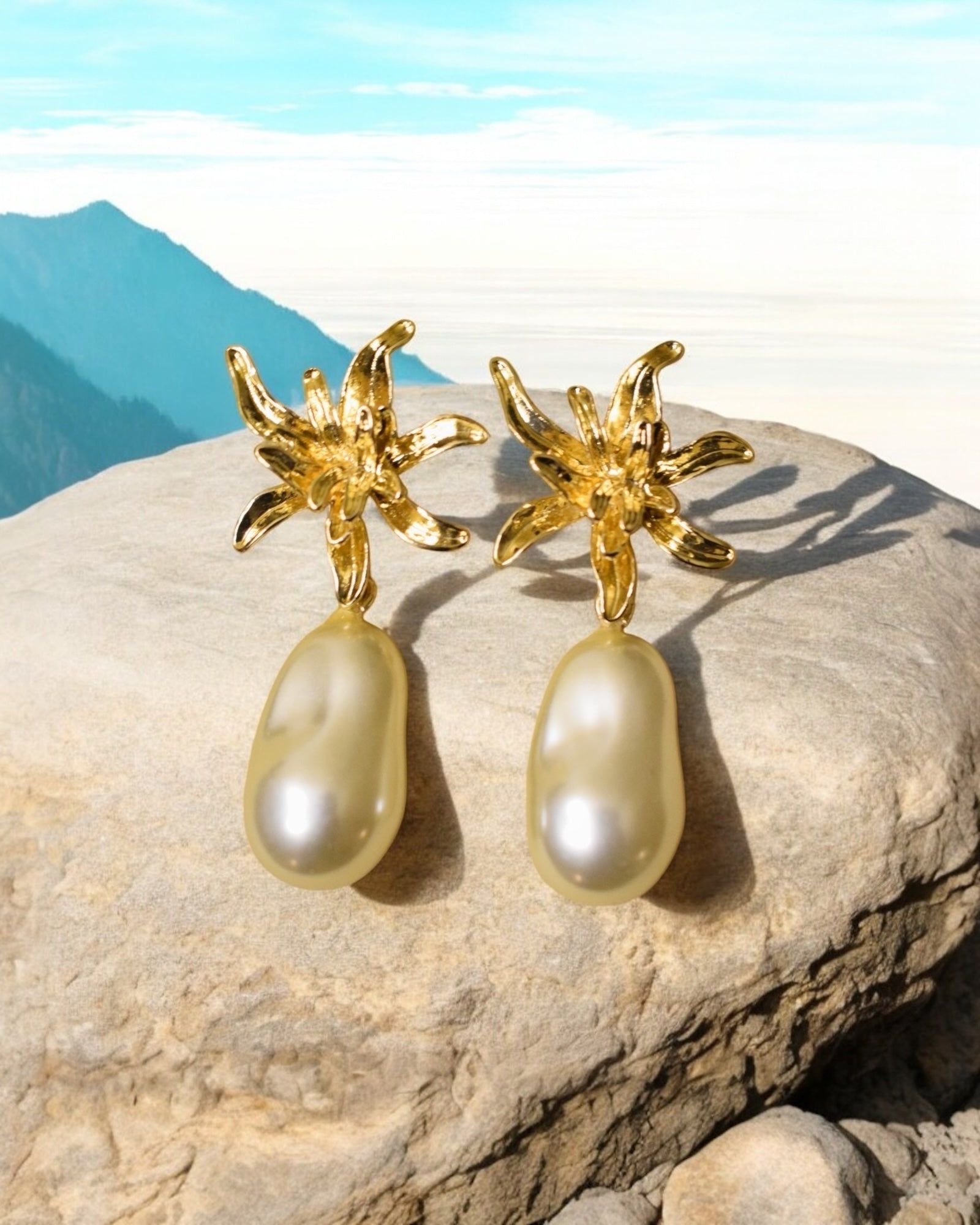 A bold blend of nature’s charm and golden elegance—these pearl drop earrings bloom like sunbursts, perfect for destination weddings, evening soirées, or wherever the light finds you.