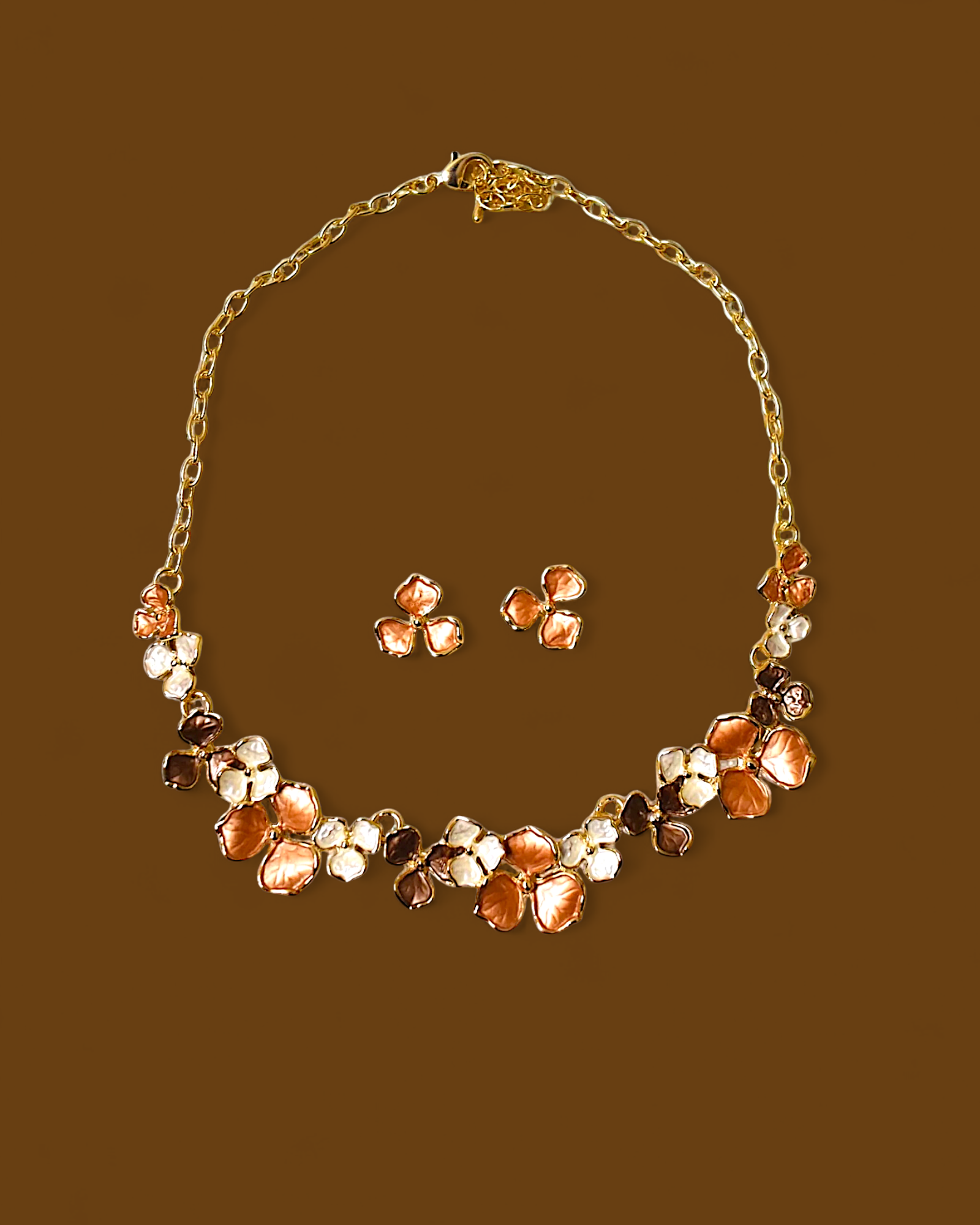 Where elegance meets nature’s softest song. This delicate necklace and earring duo blooms in hues of rose gold, champagne, and bronze—perfect for adding floral charm to weddings, brunches, or sundown soirées.