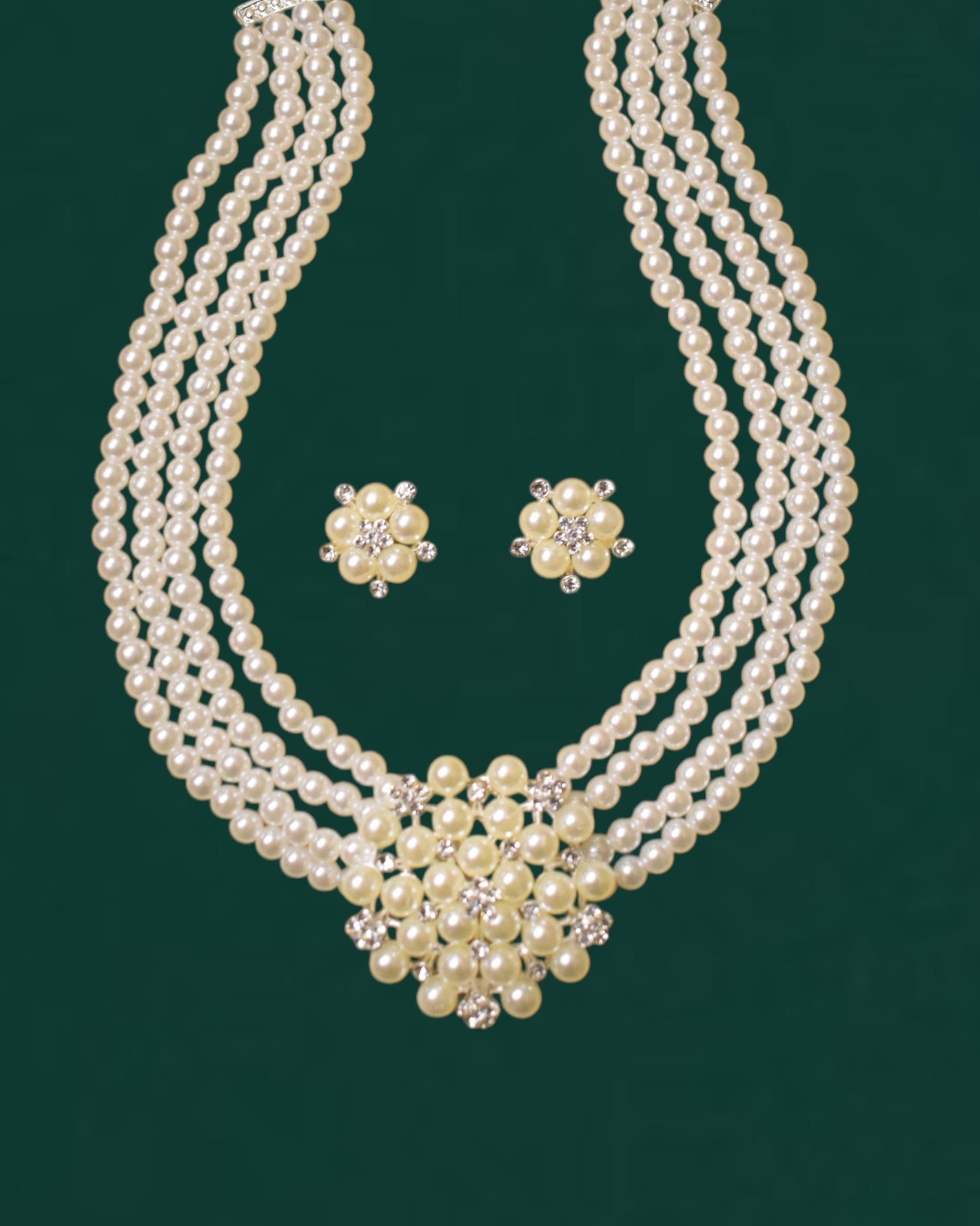 Classic pearls meet floral grandeur in the Royal Pearl Bloom Set—a stunning arrangement of layered artificial pearls and crystal-centered blossoms that evoke vintage royalty with a modern twist. Perfect for weddings, soirées, or whenever you choose to reign.