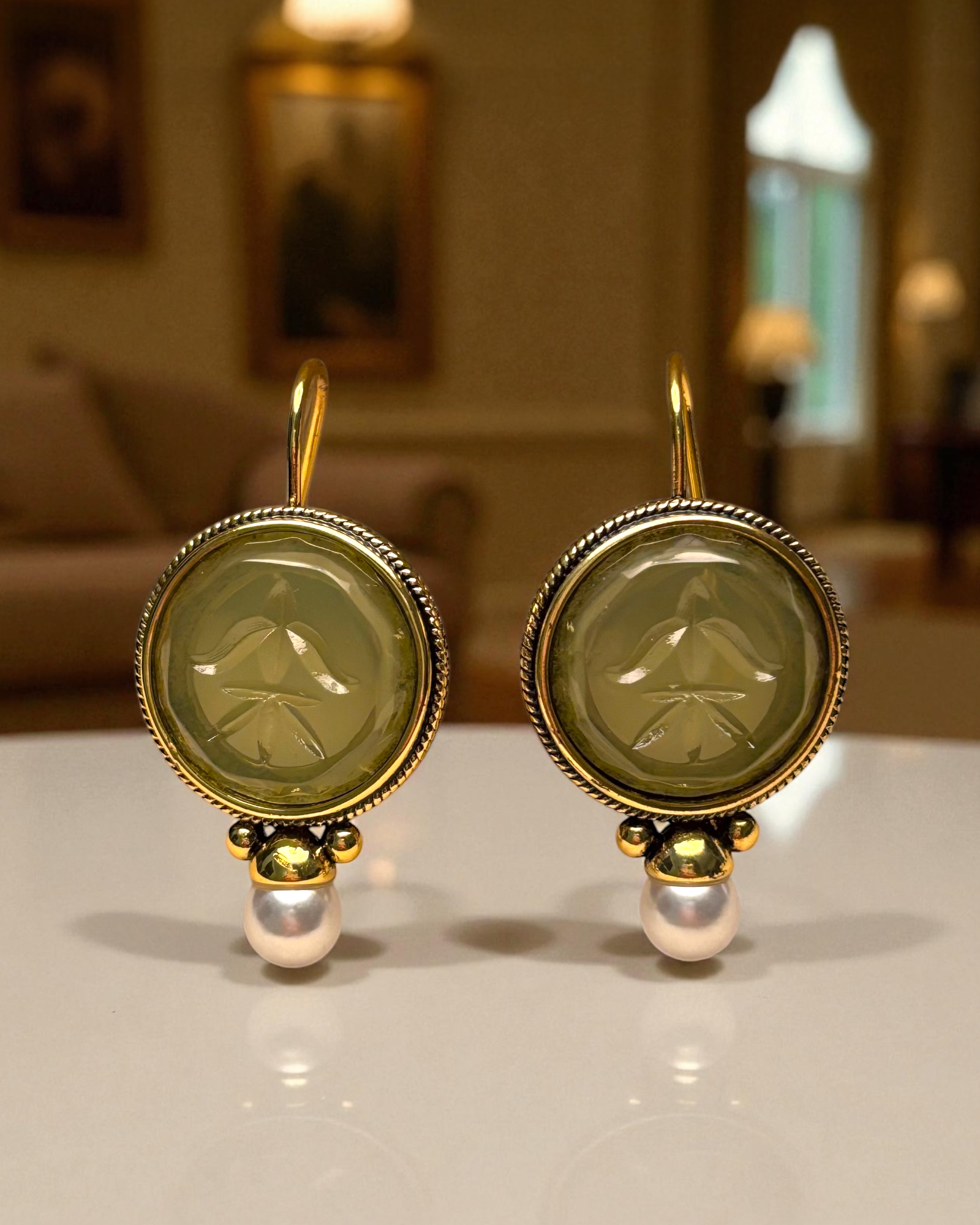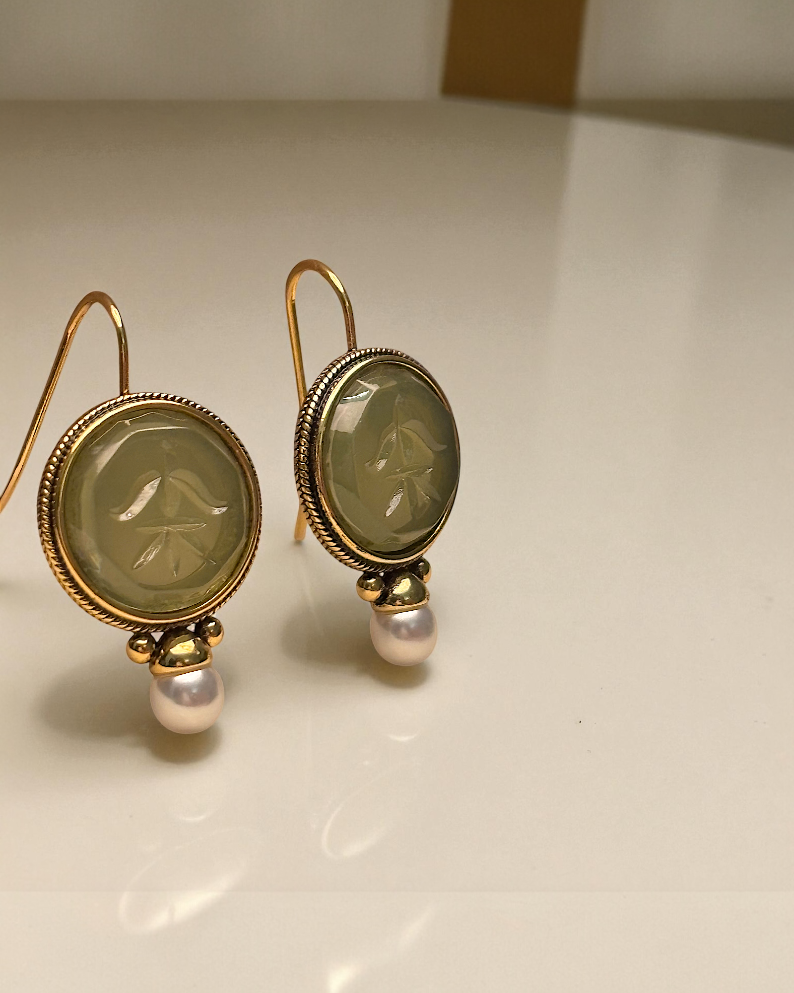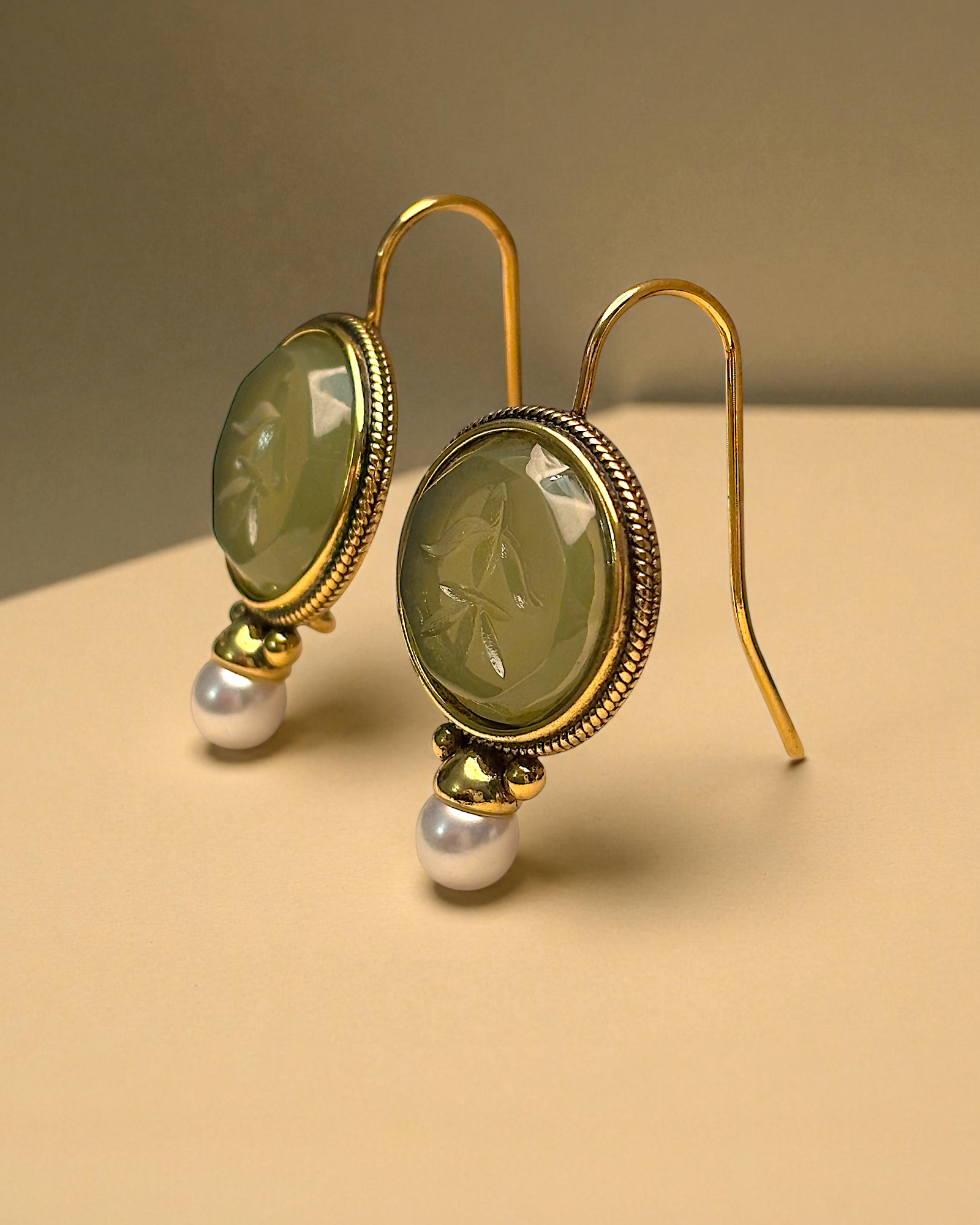 Like morning rays caught in glass, Sunlit Carvings feature delicate botanical engravings glowing from within warm citrine tones. Topped with a pearly crown, these earrings are a tribute to nature’s soft whispers and golden calm.
