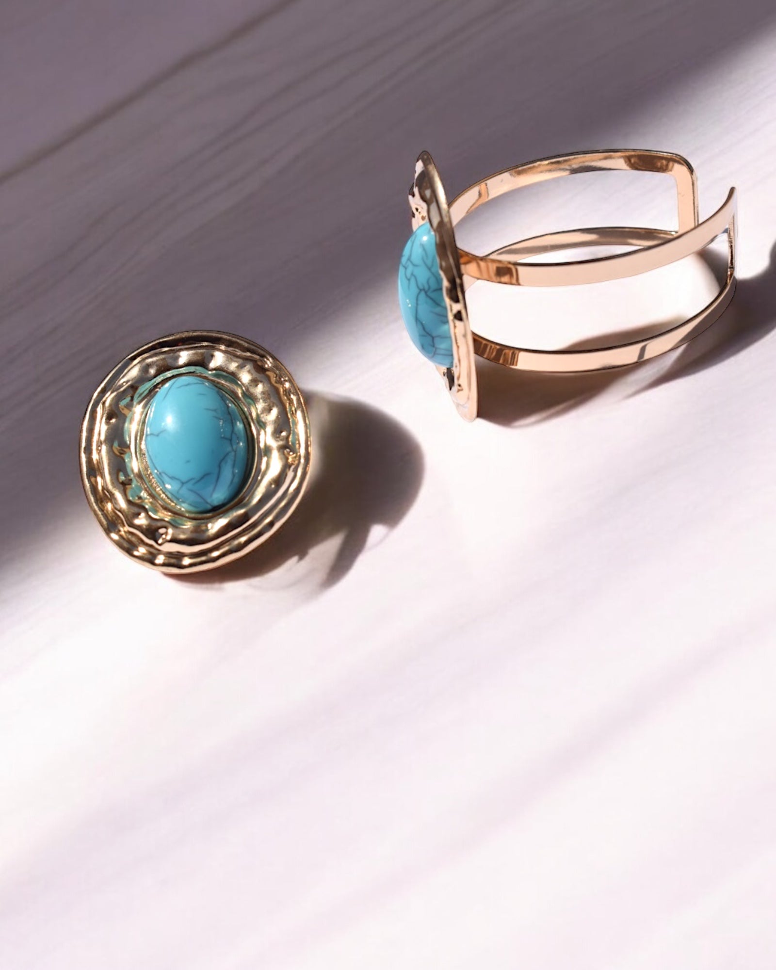 Crafted with 14K gold plating and set with a striking turquoise stone, the Turquoise Majesty Set is a masterpiece of elegance and strength. Perfect for the modern queen who embraces statement jewelry with confidence. 💫