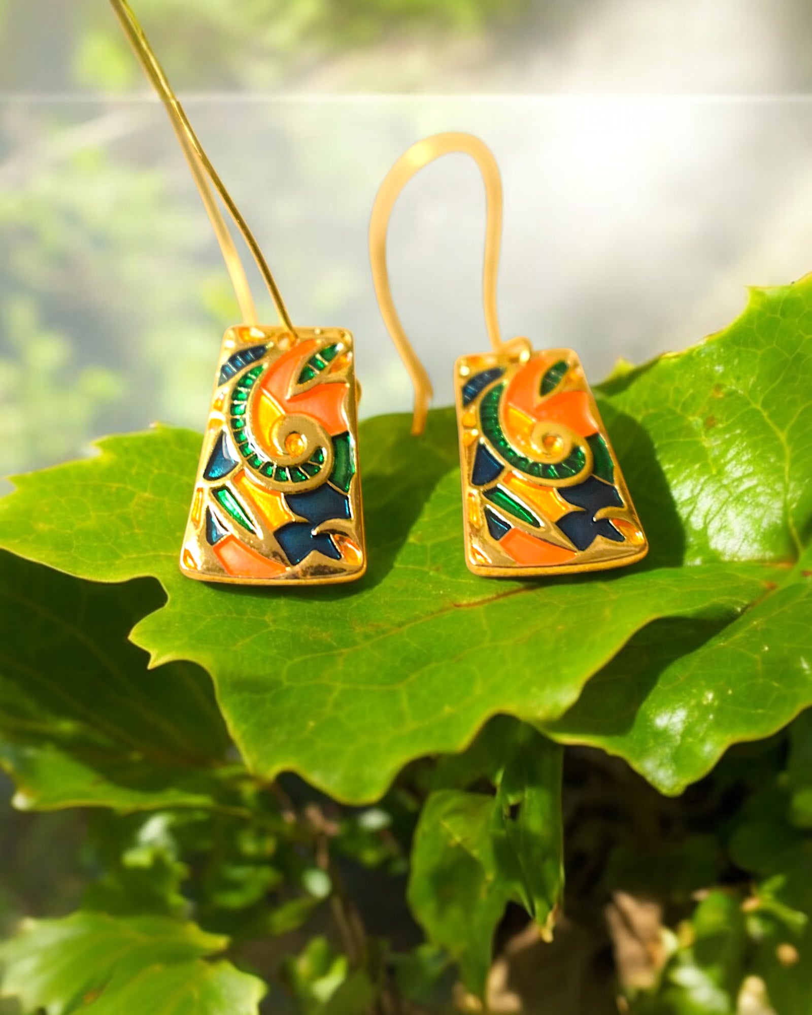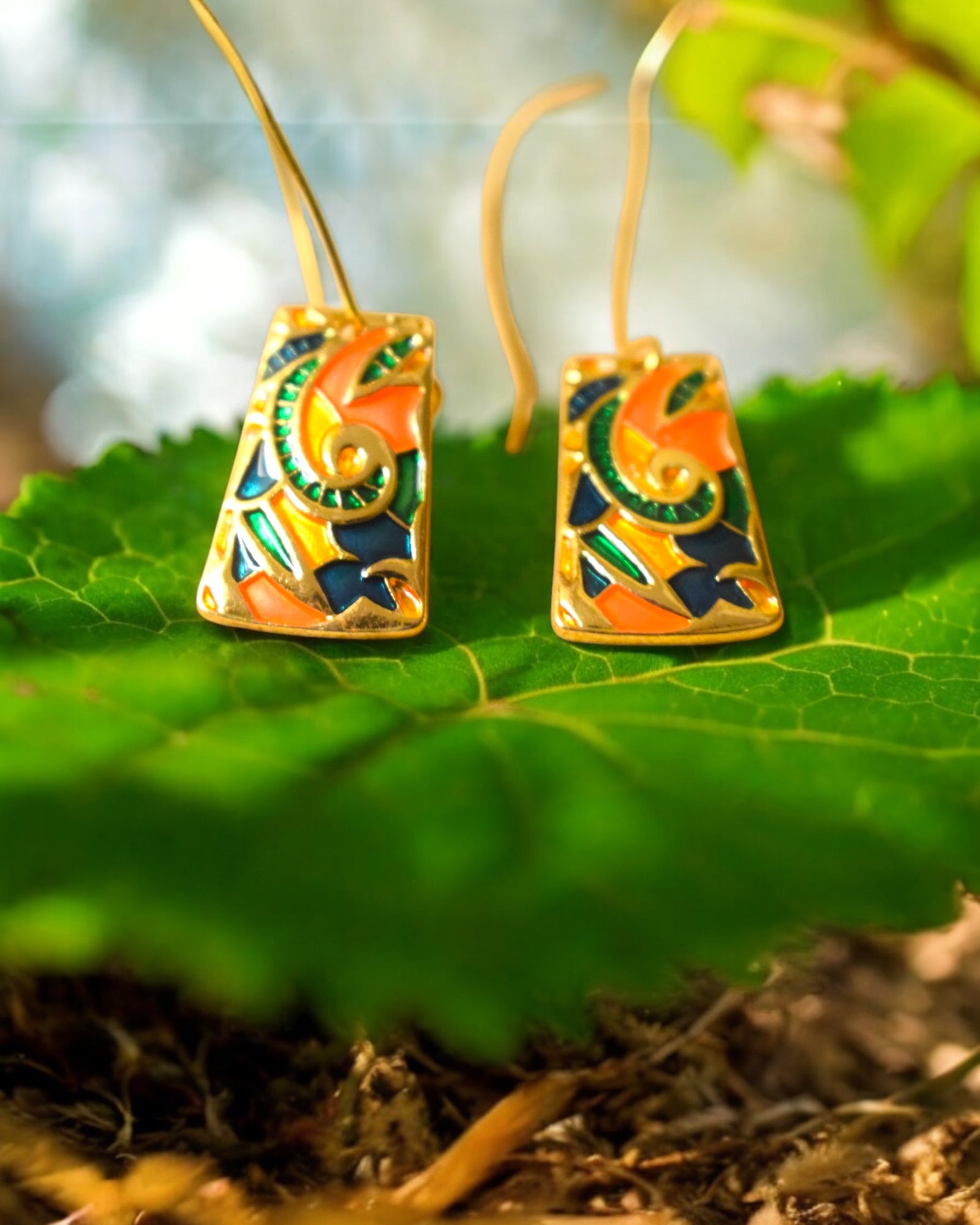 Bold geometry, radiant color, and a whisper of ancient lands — the Deco Mirage Drops are a celebration of the Art Deco era’s fearless flair. Inspired by the opulence of the 1920s and the mystique of tribal motifs, these earrings blend modernity with memory, structure with spirit. Step into timeless glamour, where vintage meets vibrance.